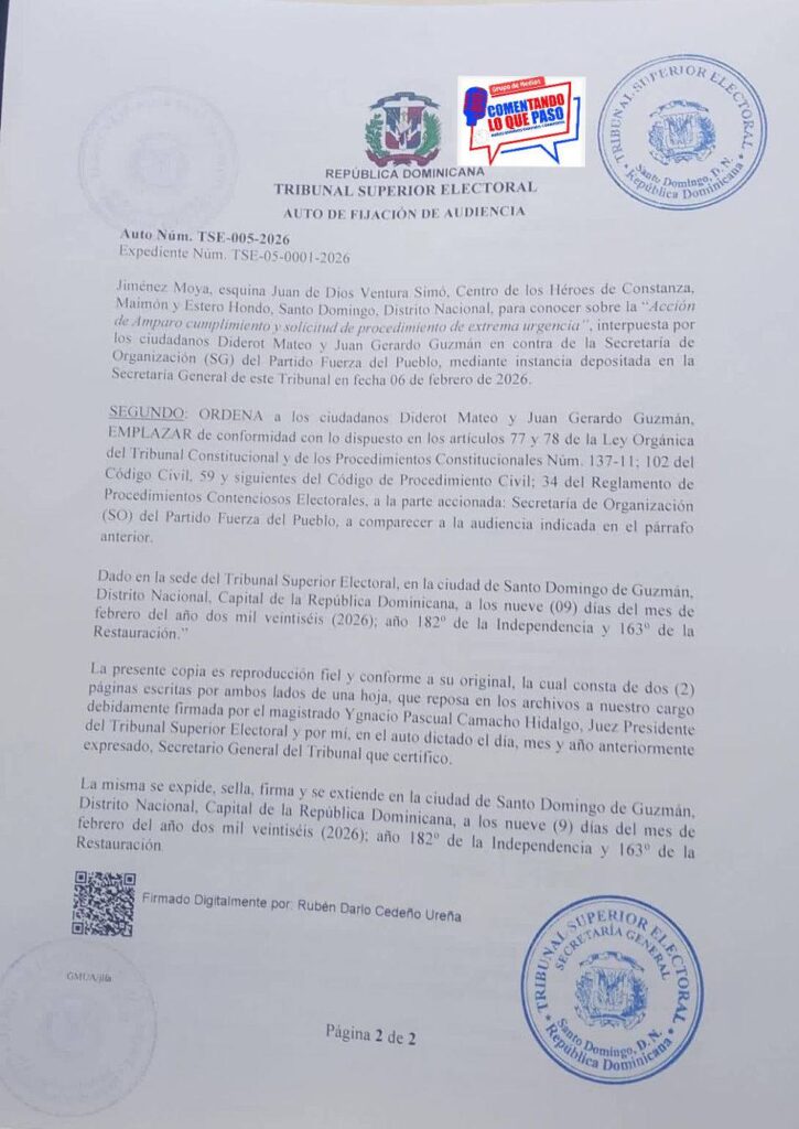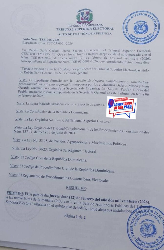 Santo Domingo Norte, R.D. – Dirigentes de la Fuerza del Pueblo (FP) en el municipio Santo Domingo Norte (SDN) depositaron una Acción de Amparo ante el Tribunal Superior Electoral (TSE), con el objetivo de solicitar la anulación del proceso interno organizado por la Comisión Nacional de Organización de ese partido, realizado el pasado domingo en dicha demarcación.