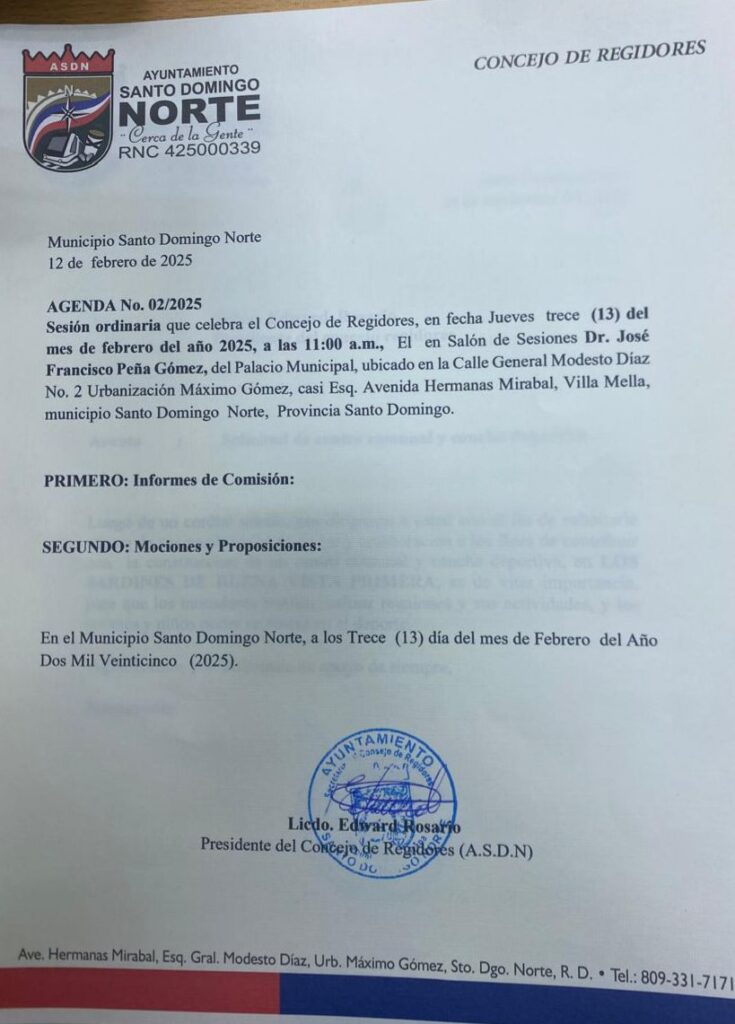 Santo Domingo Norte El Presidente del Concejo de Regidora del ayuntamiento SDN convoca a los concejales a sesión. Redaccion febrero 13, 2025 Spread the love Edward Rosario presidente del Concejo de regidor SDN convoco a los regidores a sesión este Jueves a las 11:00 AM. En la agenda se tocarán varios temas de gran importancias para el Municipio SDN.Www.comentandoloquepaso.com Continue Reading Previous: Robert Polanco recorre sector Capotillo; supervisa trabajos realiza Propeep en el populoso sector capitalinoNext: ASDN apresa dos personas y retiene siete camionetas " tipo plataneras" y varias armas blancas durante operativo conjunto Deja una respuesta Cancelar la respuestaTu dirección de correo electrónico no será publicada. Los campos obligatorios están marcados con *Comentario * Nombre * Correo electrónico * Web Guarda mi nombre, correo electrónico y web en este navegador para la próxima vez que comente. Related Stories Noticias Santo Domingo Norte Organización anuncia caminata en SDN por mujeres asesinadas Redaccion febrero 3, 2026 Noticias Santo Domingo Norte Diputado Ramón Raposo: “La Alcaldía de SDN debe ampliar su visión sobre el cuidado del medio ambiente” Redaccion febrero 3, 2026 Noticias Santo Domingo Norte Policía Nacional localiza sana y salva a niña reportada como desaparecida en Los Guaricanos, SDN Redaccion febrero 2, 2026