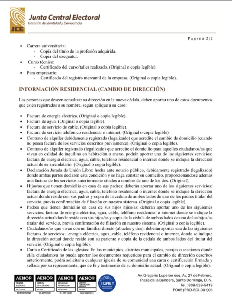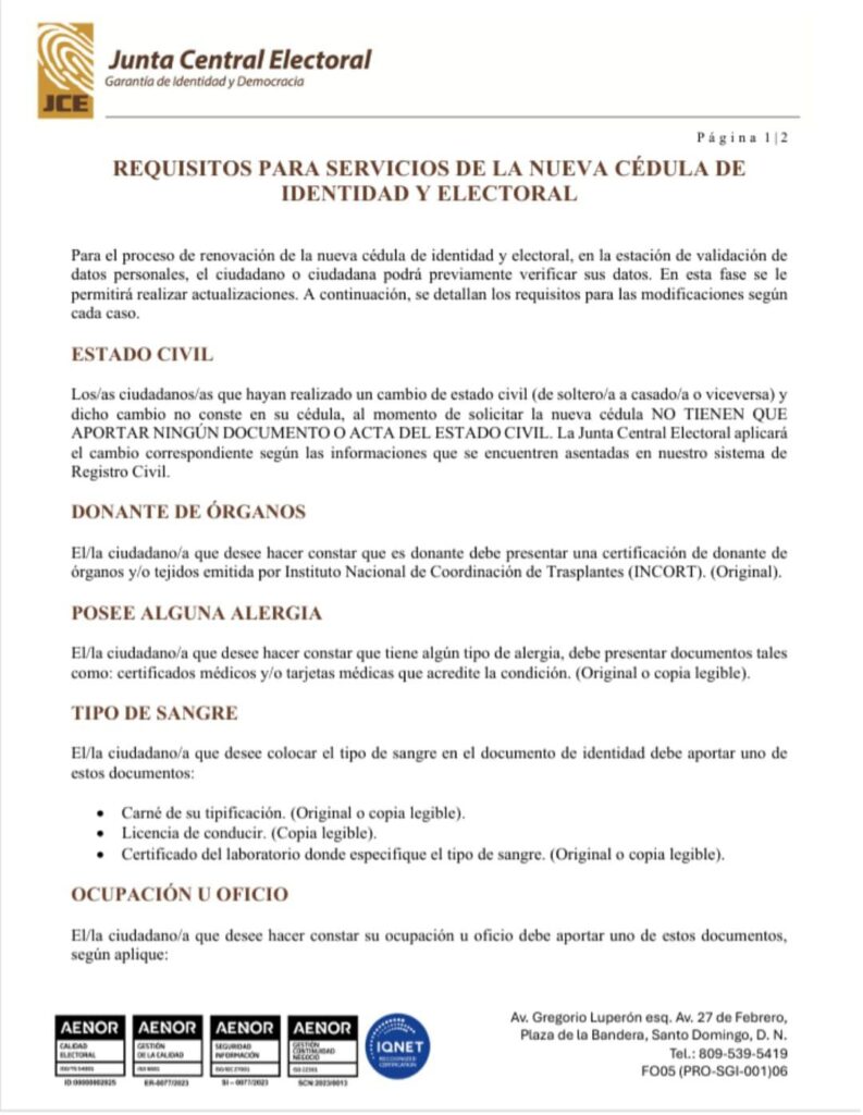 La Junta Central Electoral (JCE) dio a conocer este sábado los requisitos para acceder a los servicios relacionados con la nueva cédula de identidad y electoral, en el marco del proceso de modernización del sistema de identificación nacional.